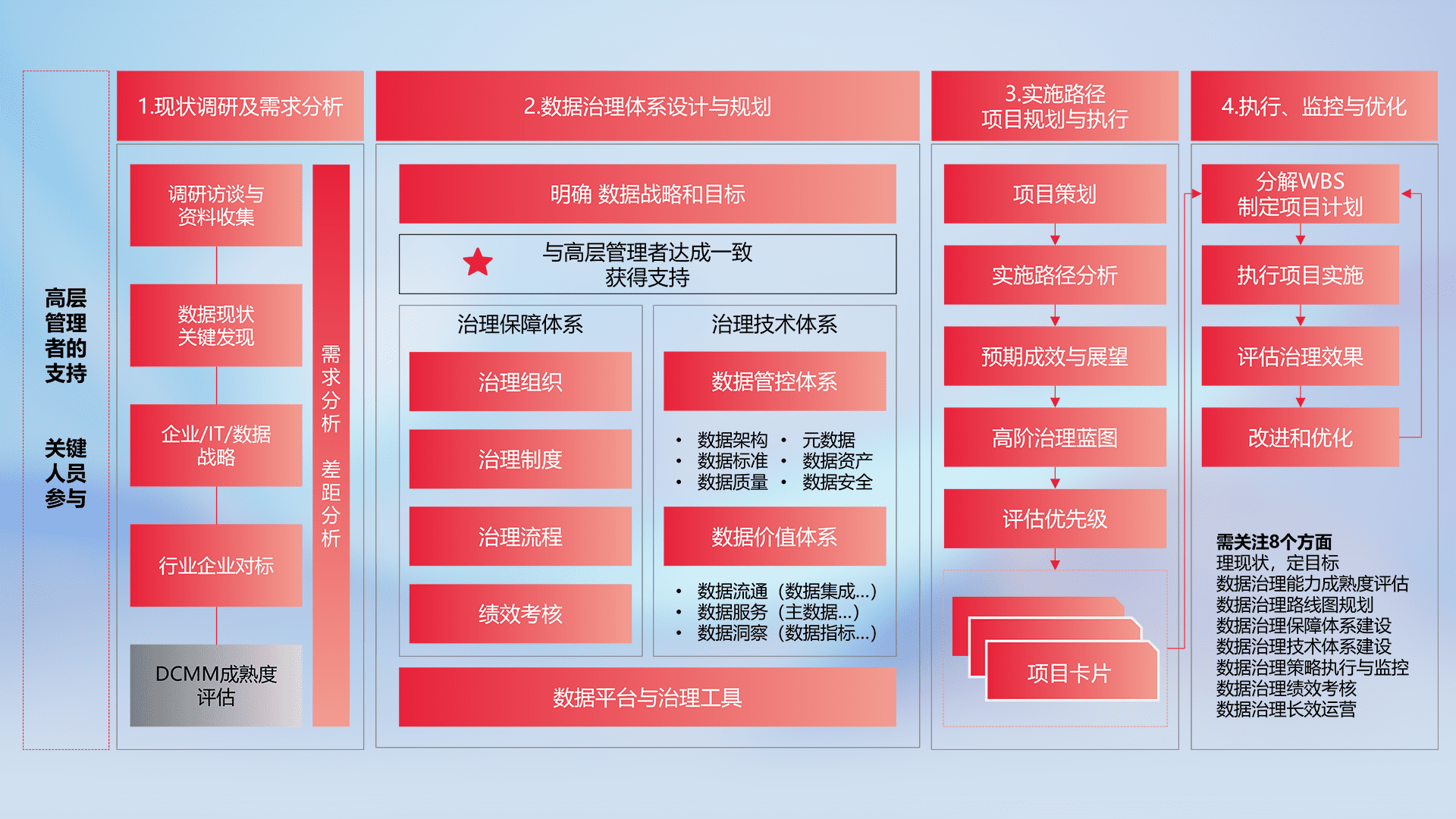 制定并执行统一的数据标准,,,,规范数据定义和格式,,,,消除冗余和不一致性,,实现跨部门和跨系统的数据一致性,,,,为企业提供标准化的数据基础。。
